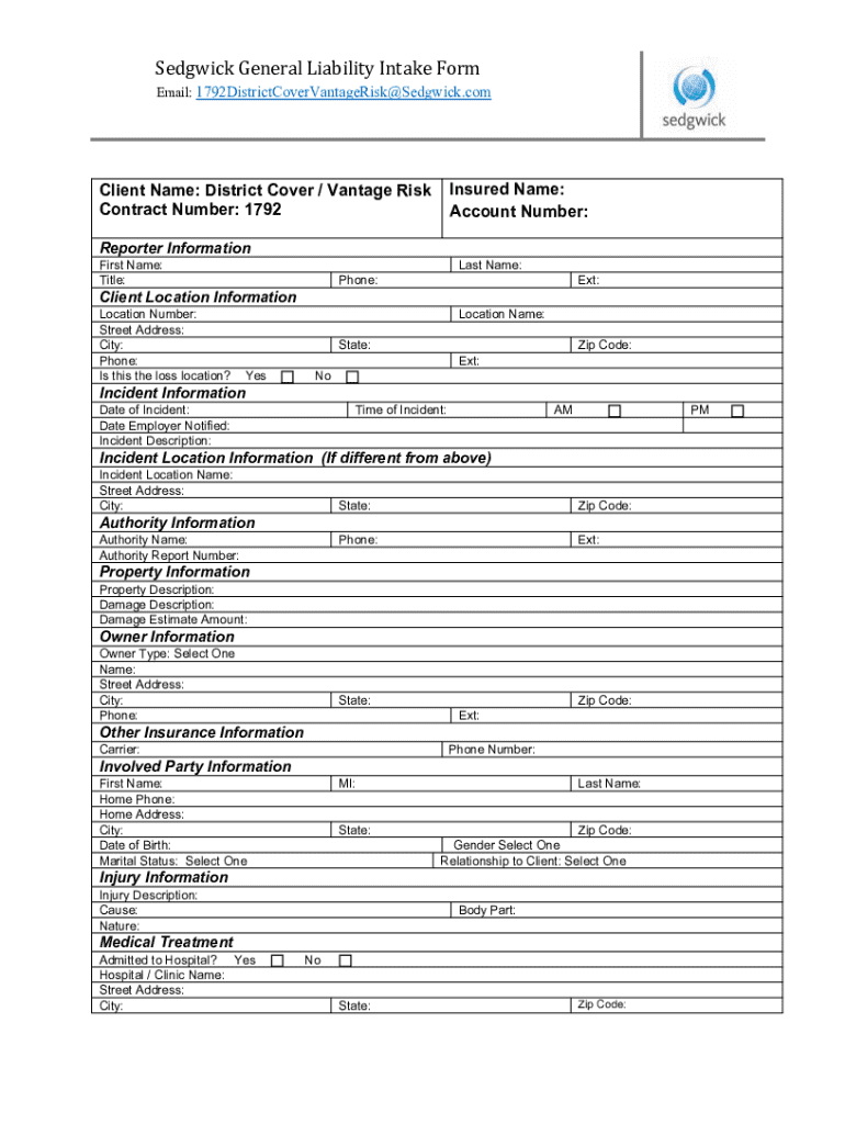 Sedgwick General Liability Intake Form Email: 1792DistrictCoverVantageRisk@Sedgwick.comInsured Name: Account Number:Client Name: District Cover / Vantage Risk Contract Number: 1792 Reporter Information