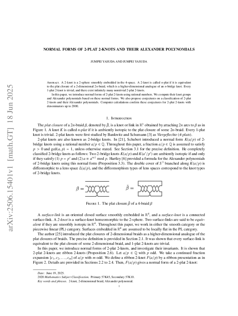 NORMAL FORMS OF 2PLAT 2KNOTS AND THEIR ALEXANDER POLYNOMIALSarXiv:2506.15401v1 [math.GT] 18 Jun 2025JUMPEI YASUDA AND JUMPEI YASUDAAbstract. A 2knot is a 2sphere smoothly embedded in the 4space. A