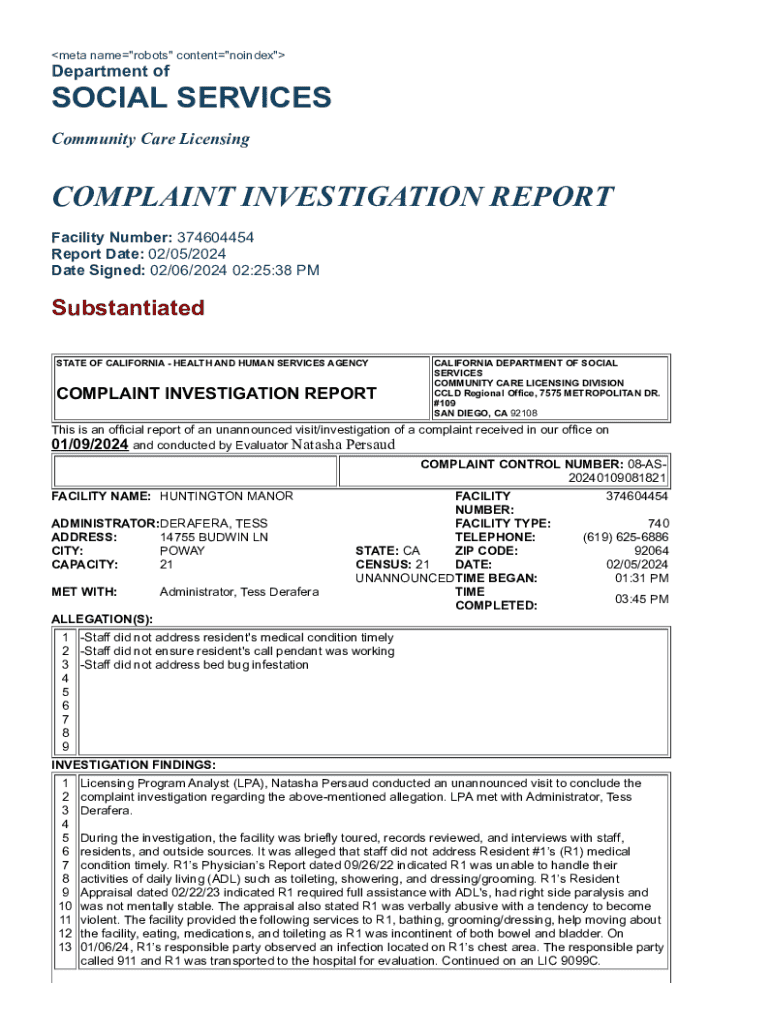 meta name\"robots\" content\"noindex\"Department ofSOCIAL SERVICES Community Care LicensingCOMPLAINT INVESTIGATION REPORT Facility Number: 374604454 Report Date: 02/05/2024 Date Signed: 02/06/2024