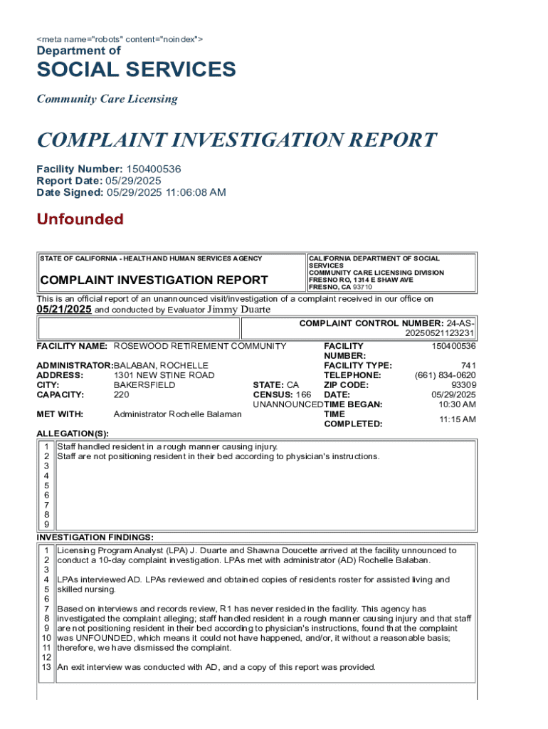 meta name\"robots\" content\"noindex\"Department ofSOCIAL SERVICES Community Care LicensingCOMPLAINT INVESTIGATION REPORT Facility Number: 150400536 Report Date: 05/29/2025 Date Signed: 05/29/2025