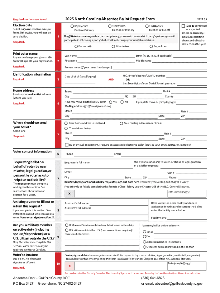 Requesting an absentee ballot form in North Carolina is straightforward. Voters can obtain the form through various channels, including online access through the North Carolina State Board of Elections website or directly from their local county board of elections. Online resources provide downloadable forms that can be printed, filled out, and submitted efficiently.