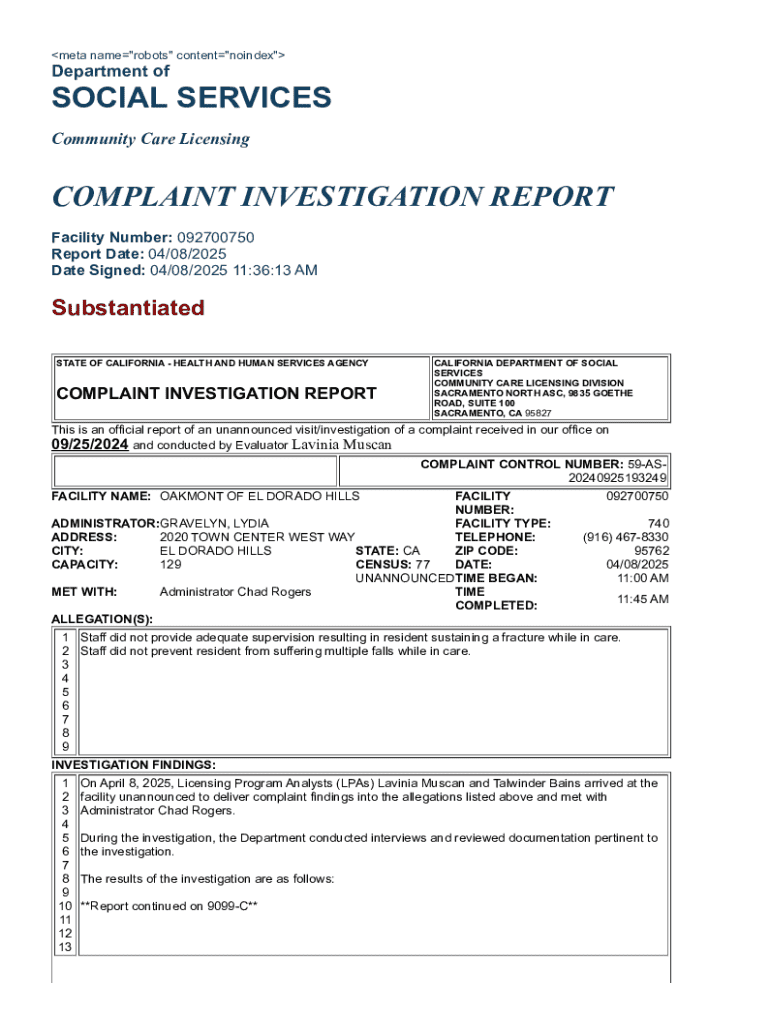 meta name\"robots\" content\"noindex\"Department ofSOCIAL SERVICES Community Care LicensingCOMPLAINT INVESTIGATION REPORT Facility Number: 092700750 Report Date: 04/08/2025 Date Signed: 04/08/2025