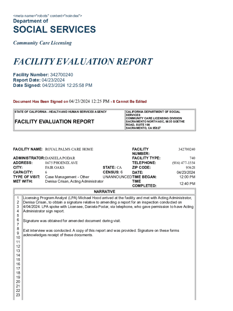 meta name\"robots\" content\"noindex\"Department ofSOCIAL SERVICES Community Care LicensingFACILITY EVALUATION REPORT Facility Number: 342700240 Report Date: 04/23/2024 Date Signed: 04/23/2024 12:25:58