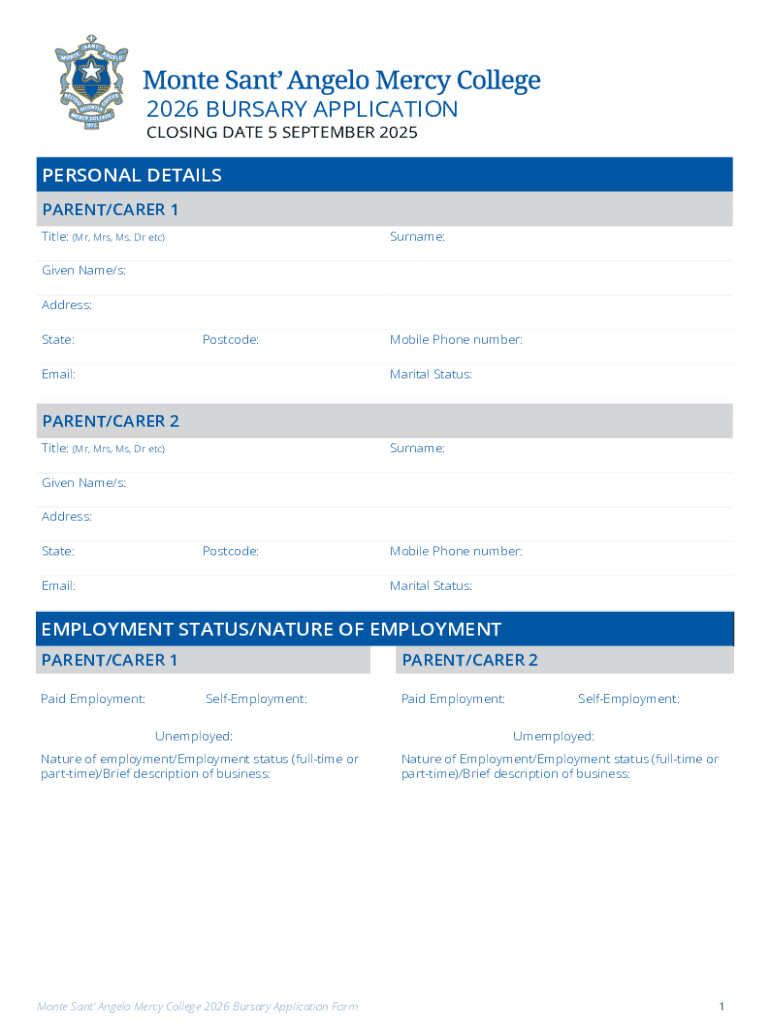 2026 BURSARY APPLICATION CLOSING DATE 5 SEPTEMBER 2025PERSONAL DETAILS PARENT/CARER 1 Title: (Mr, Mrs, Ms, Dr etc)Surname:Given Name/s: Address: State:Postcode:Email:Mobile Phone number: Marital Status:PARENT/CARER