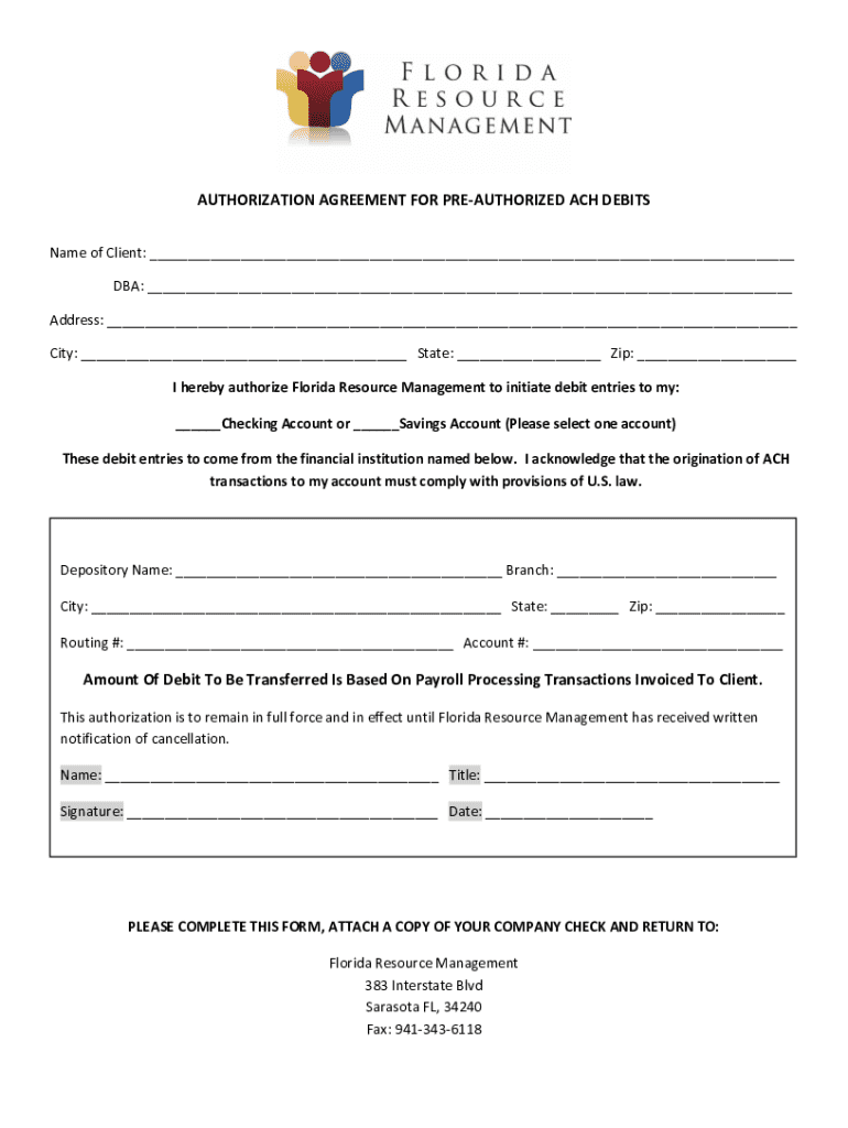 AUTHORIZATION AGREEMENT FOR PREAUTHORIZED ACH DEBITS Name of Client: ___ DBA: ___ Address: ___ City: ___ State: ___ Zip: ___ I hereby authorize Florida Resource Management to initiate debit entries