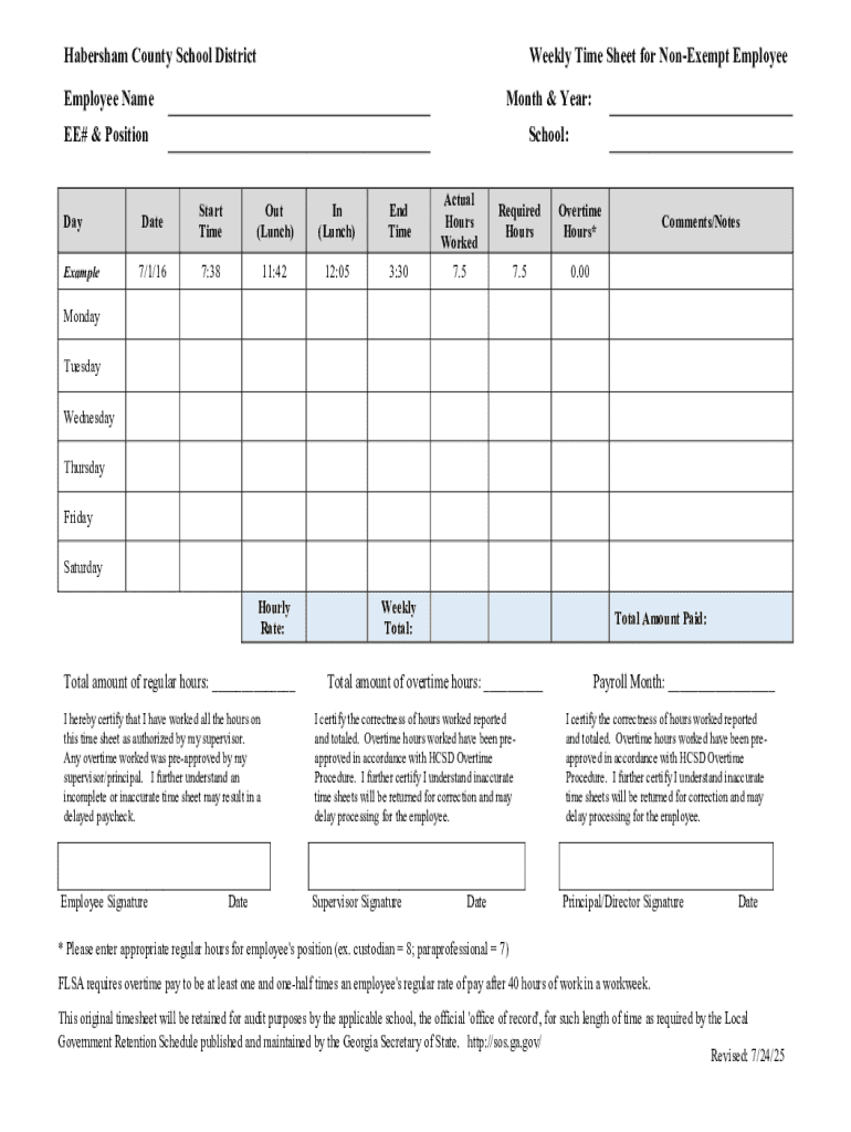 Habersham County School DistrictWeekly Time Sheet for NonExempt EmployeeEmployee NameMonth & Year:EE# & PositionSchool:DayDateStart TimeOut (Lunch)In (Lunch)End TimeActual Hours WorkedRequired HoursOvertime