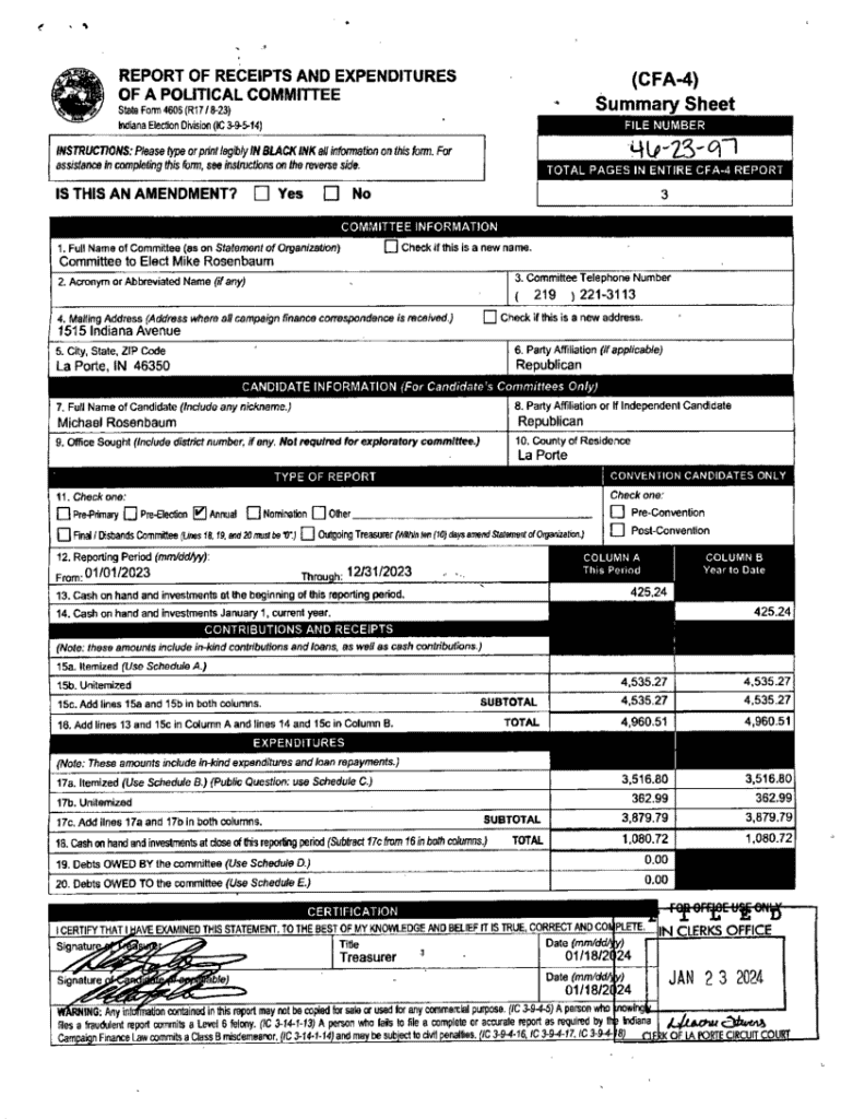 % .REPORT OF RECEIPTS AND EXPENDITURES OF A POLITICAL COMMITTEE(CFA4) Summary SheetStats Form 4605Rt7/823) Indiana Election Division (10 39M4)FILE NUMBERINSTRUCTIONS: Please type or print legibly
