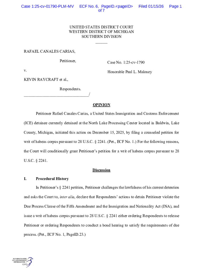 Case 1:25cv01790PLMMVECF No. 6, PageID.pageID of 7Filed 01/15/26Page 1UNITED STATES DISTRICT COURT WESTERN DISTRICT OF MICHIGAN SOUTHERN DIVISION ___ RAFAEL CANALES CARIAS, Petitioner, v.Case No.