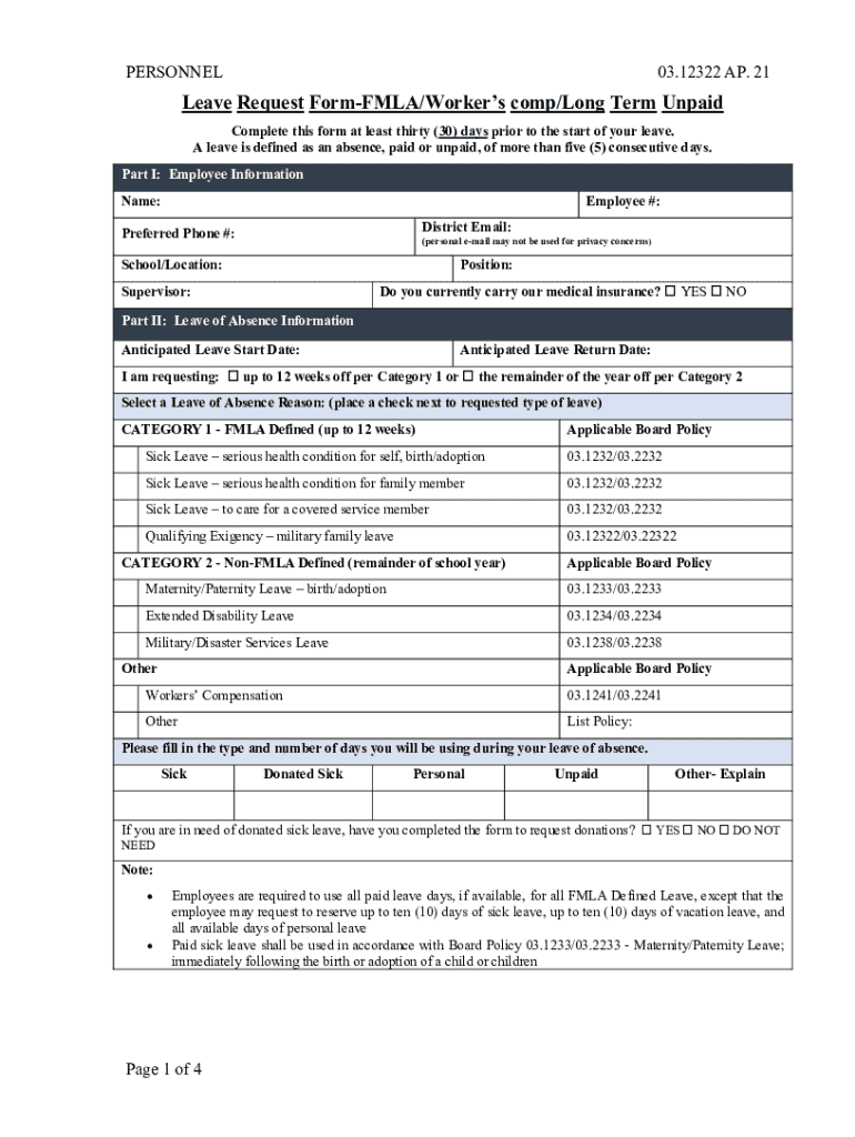 PERSONNEL03.12322 AP. 21Leave Request FormFMLA/Workers comp/Long Term Unpaid Complete this form at least thirty (30) days prior to the start of your leave. A leave is defined as an absence, paid or