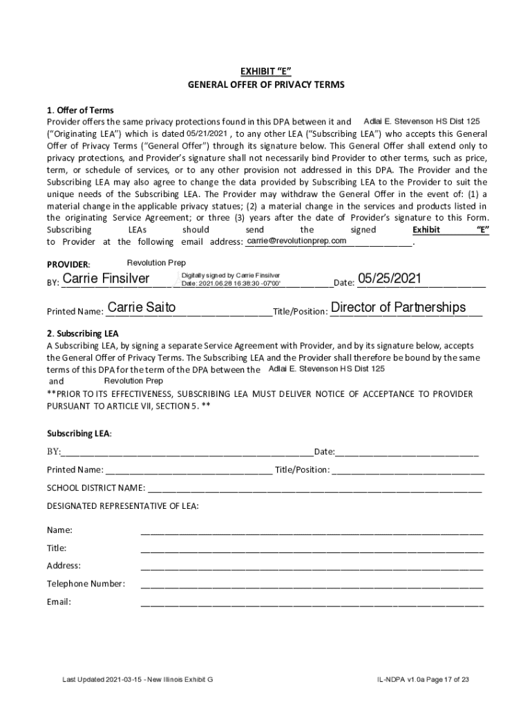 EXHIBIT E GENERAL OFFER OF PRIVACY TERMS 1. Offer of Terms Provider offers the same privacy protections found in this DPA between it and Adlai E. Stevenson HS Dist 125 O igina ing LEA which is dated