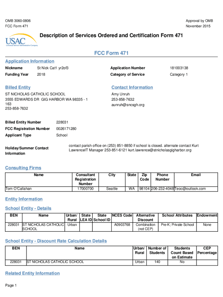 OMB 30600806 FCC Form 471Approval by OMB November 2015Description of Services Ordered and Certification Form 471 FCC Form 471 Application Information NicknameSt Nick Cat1 yr2of3Application Number181003138Funding