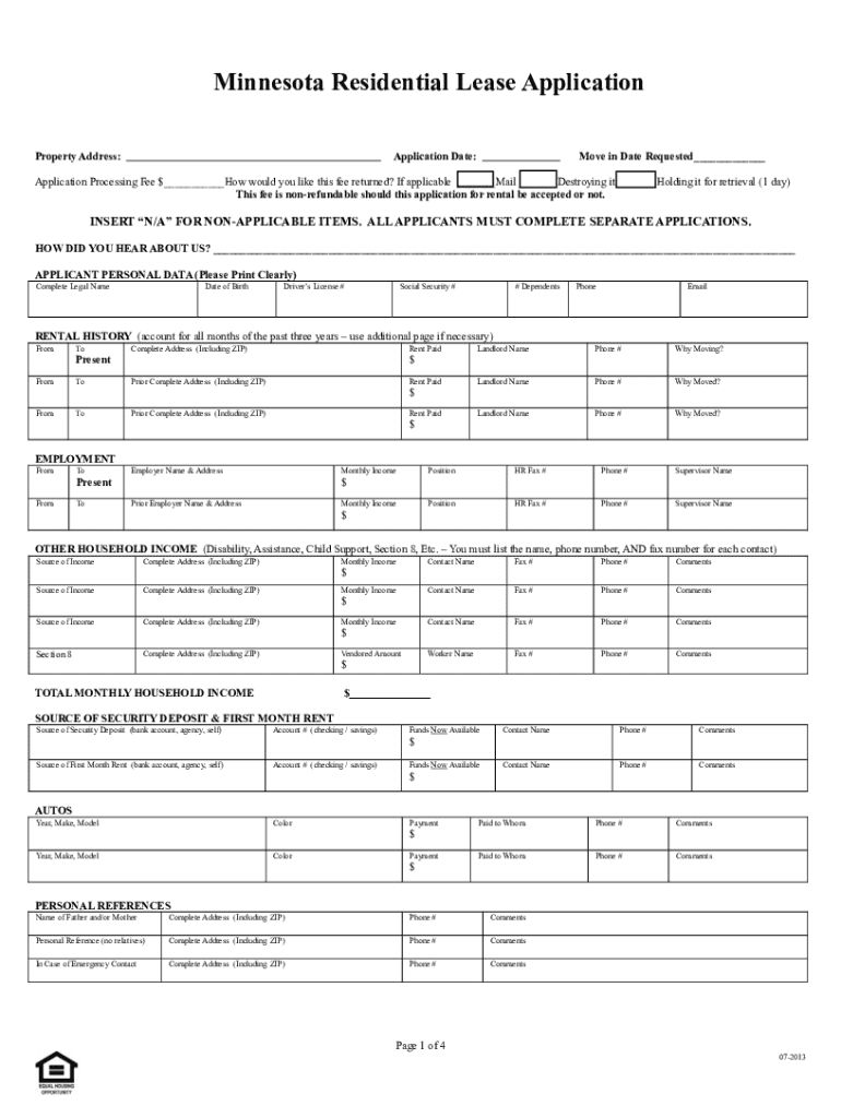 Minnesota Residential Lease Application Property Address:Application Date:Move in Date Requested___Application Processing Fee $___How would you like this fee returned? If applicable ___Mail ___Destroying