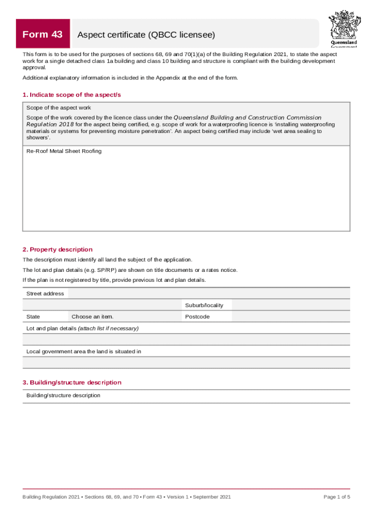 The 43v2 aspect certificate re-roof form consists of several sections that cater to various aspects of the re-roofing process. From contractor details to material specifications, each area is critical for ensuring a smooth project.