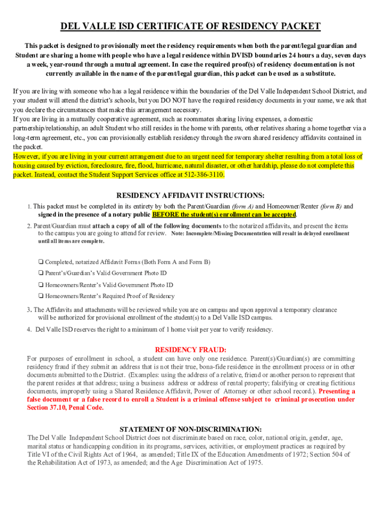 DEL VALLE ISD CERTIFICATE OF RESIDENCY PACKET This packet is designed to provisionally meet the residency requirements when both the parent/legal guardian and Student are sharing a home with people