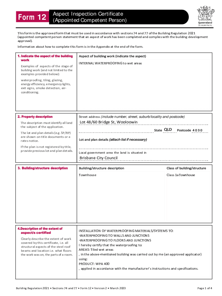 Submitting a Form 12 Aspect Inspection Certificate involves several legal implications. It must adhere to local laws and regulations, such as the Building Act and specific codes within state jurisdictions. Non-compliance can lead to serious repercussions, including project delays, fines, or even legal action against builders and certifiers.