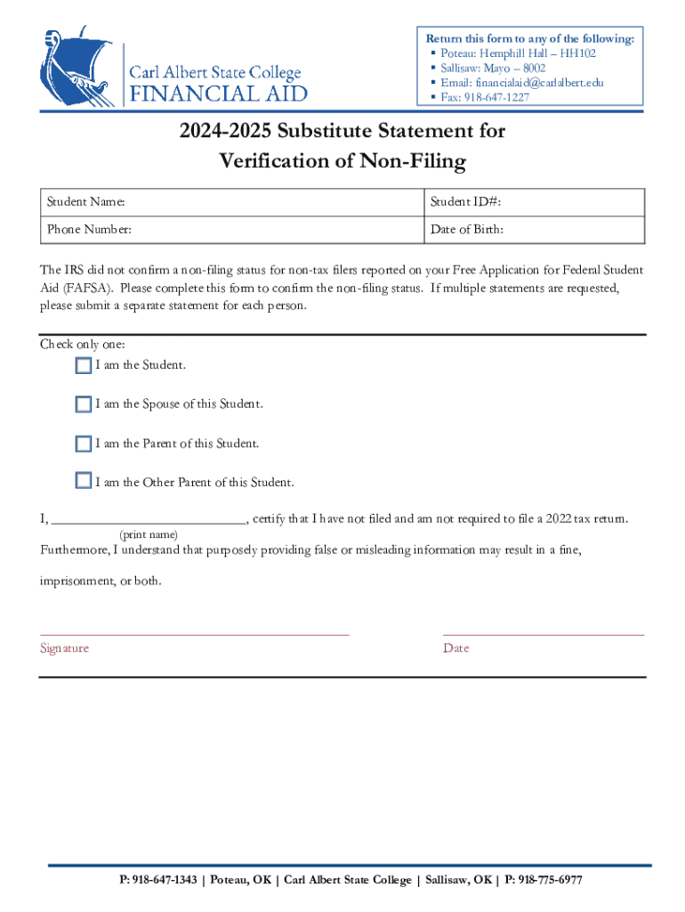 Return this form to any of the following:Poteau: Hemphill HallHH102Sallisaw: Mayo8002Email: financialaid@carlalbert.eduFax: 918647122720242025 Substitute Statement for Verification of NonFiling Student
