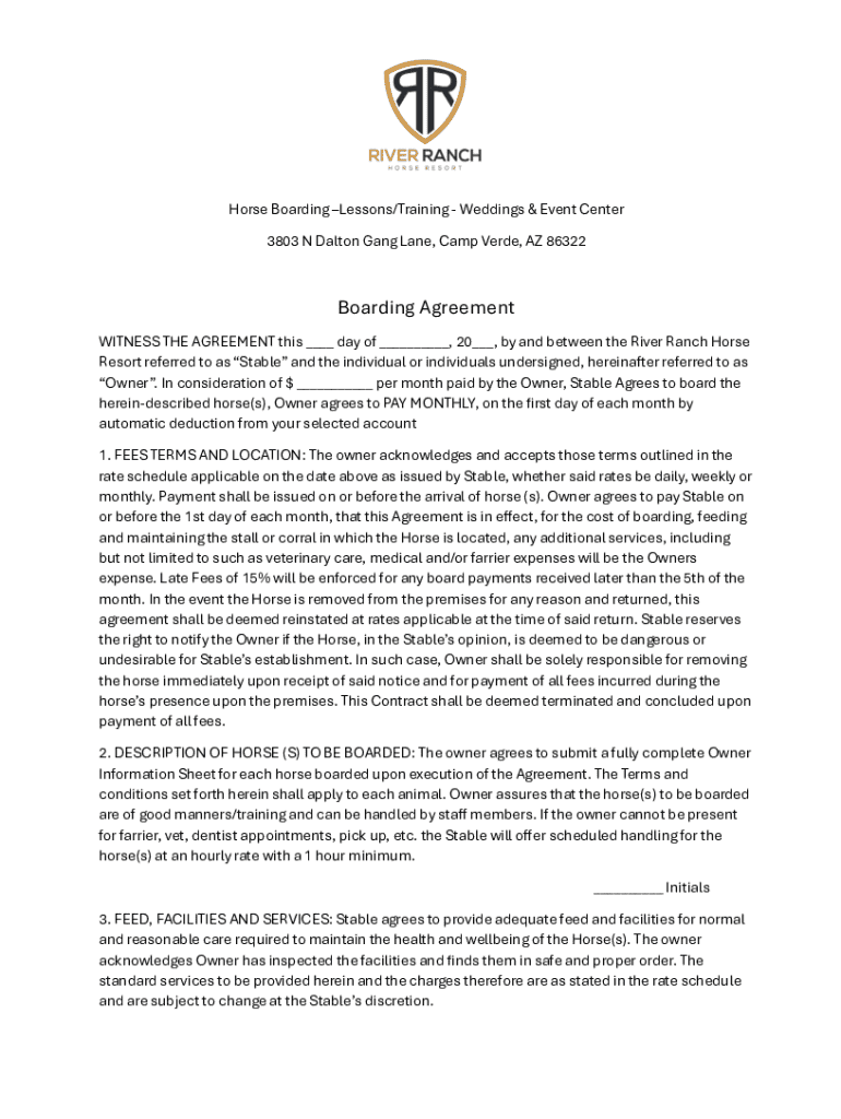 Horse Boarding Lessons/TrainingWeddings & Event Center 3803 N Dalton Gang Lane, Camp Verde, AZ 86322Boarding Agreement WITNESS THE AGREEMENT this ___ day of ___, 20___, by and between the River Ranch