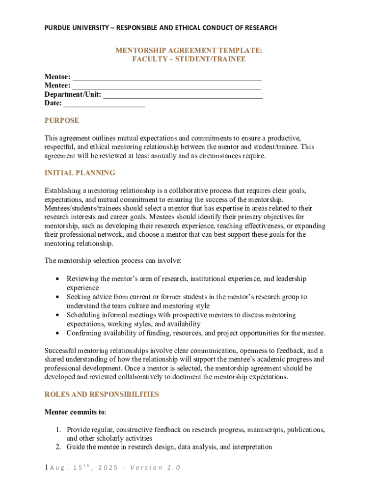 PURDUE UNIVERSITYRESPONSIBLE AND ETHICAL CONDUCT OF RESEARCH MENTORSHIP AGREEMENT TEMPLATE: FACULTYSTUDENT/TRAINEE Mentor: ___ Mentee: ___ Department/Unit: ___ Date: ___ PURPOSE This agreement outlines