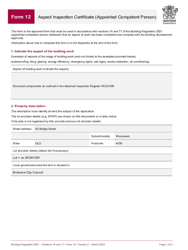 Form 12Aspect Inspection Certificate (Appointed Competent Person)This form is the approved form that must be used in accordance with sections 74 and 77 of the Building Regulation 2021 (appointed competent