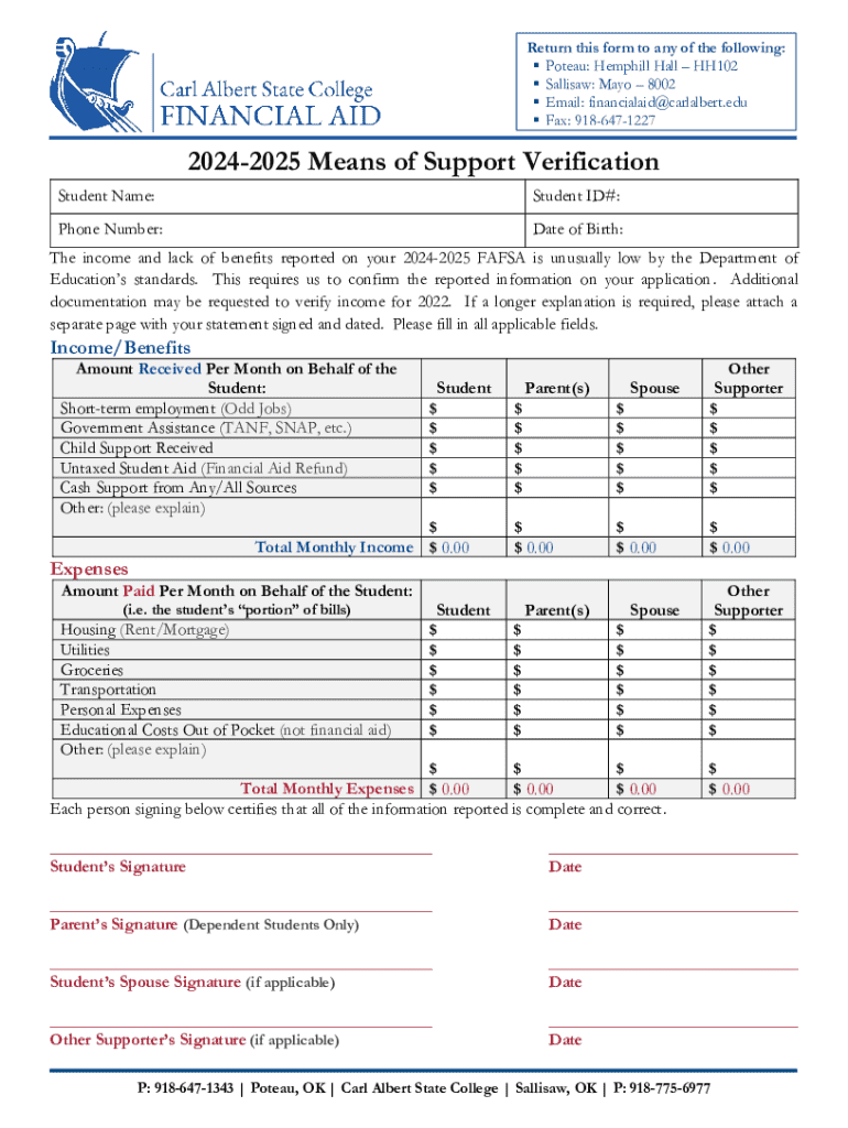 Return this form to any of the following:Poteau: Hemphill HallHH102Sallisaw: Mayo8002Email: financialaid@carlalbert.eduFax: 918647122720242025 Means of Support Verification Student Name:Student ID#:Phone