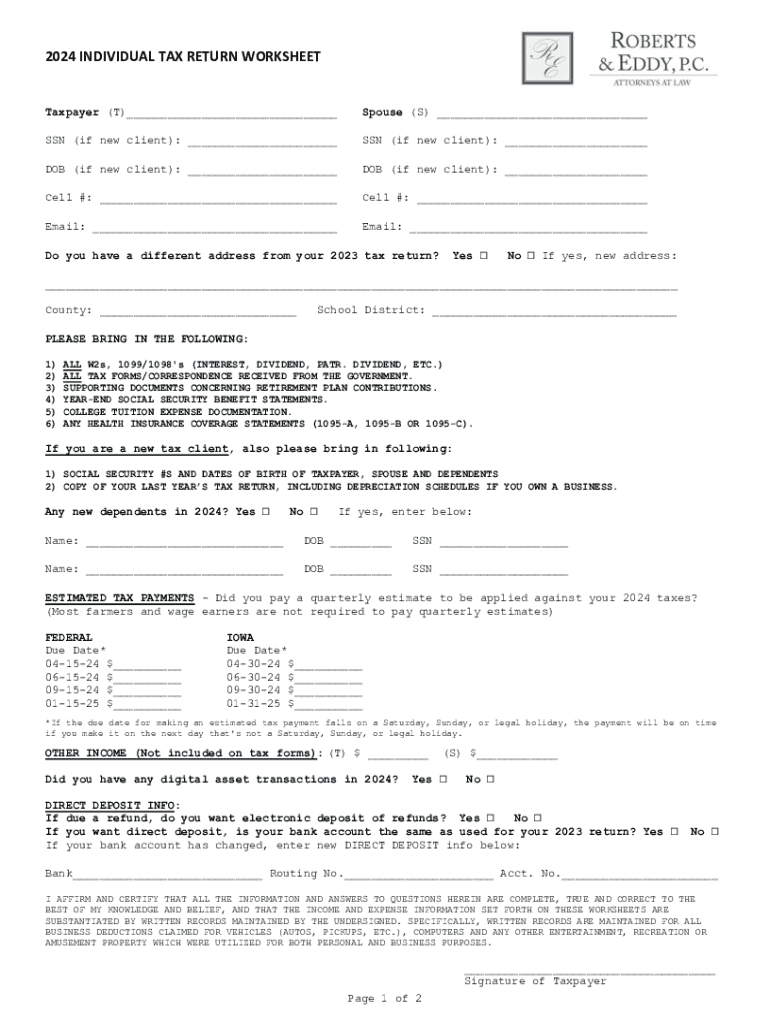 Get the free 2024 INDIVIDUAL TAX RETURN WORKSHEET