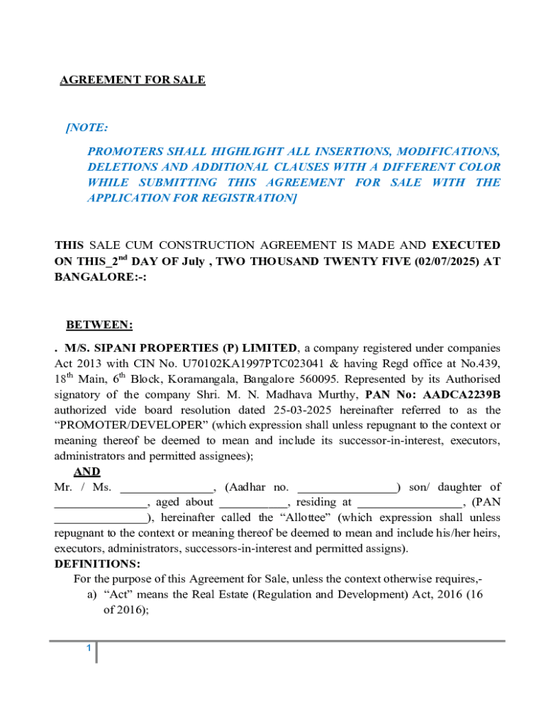 AGREEMENT FOR SALE[NOTE: PROMOTERS SHALL HIGHLIGHT ALL INSERTIONS, MODIFICATIONS, DELETIONS AND ADDITIONAL CLAUSES WITH A DIFFERENT COLOR WHILE SUBMITTING THIS AGREEMENT FOR SALE WITH THE APPLICATION