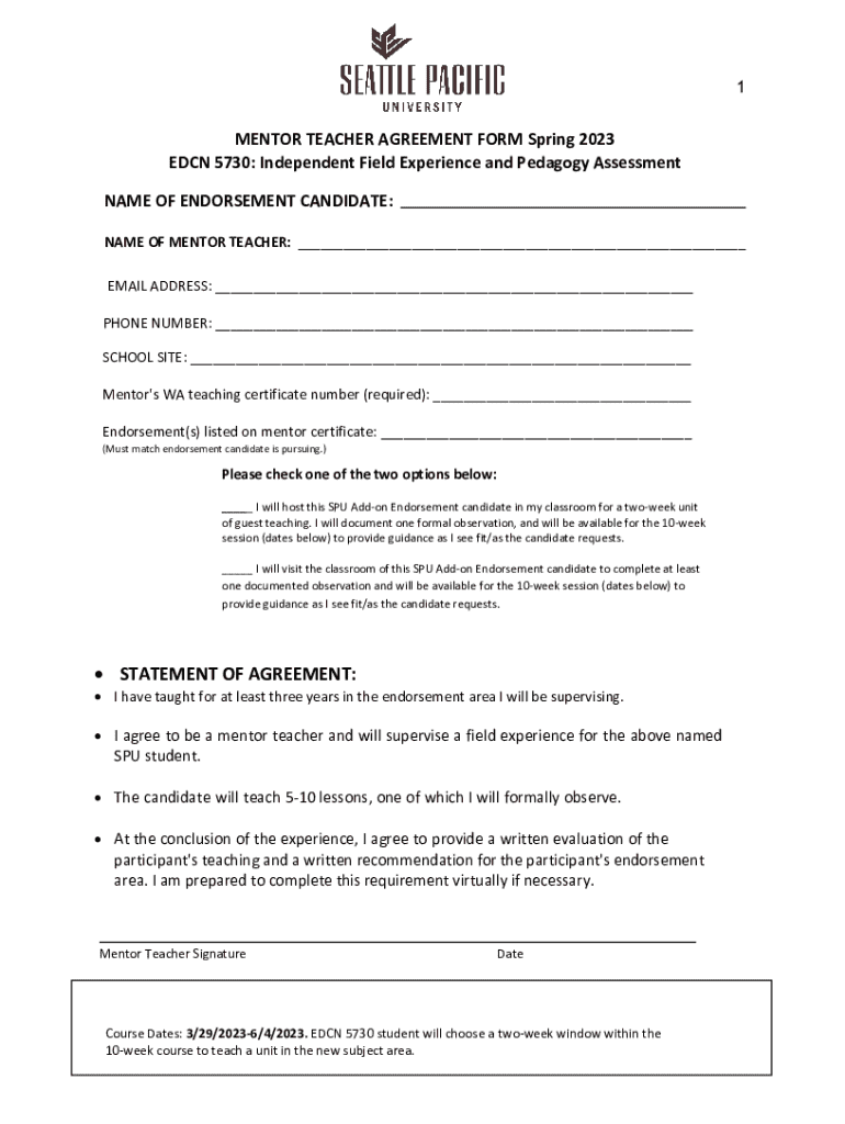 Get the free MENTOR TEACHER AGREEMENT FORM Winter 2026