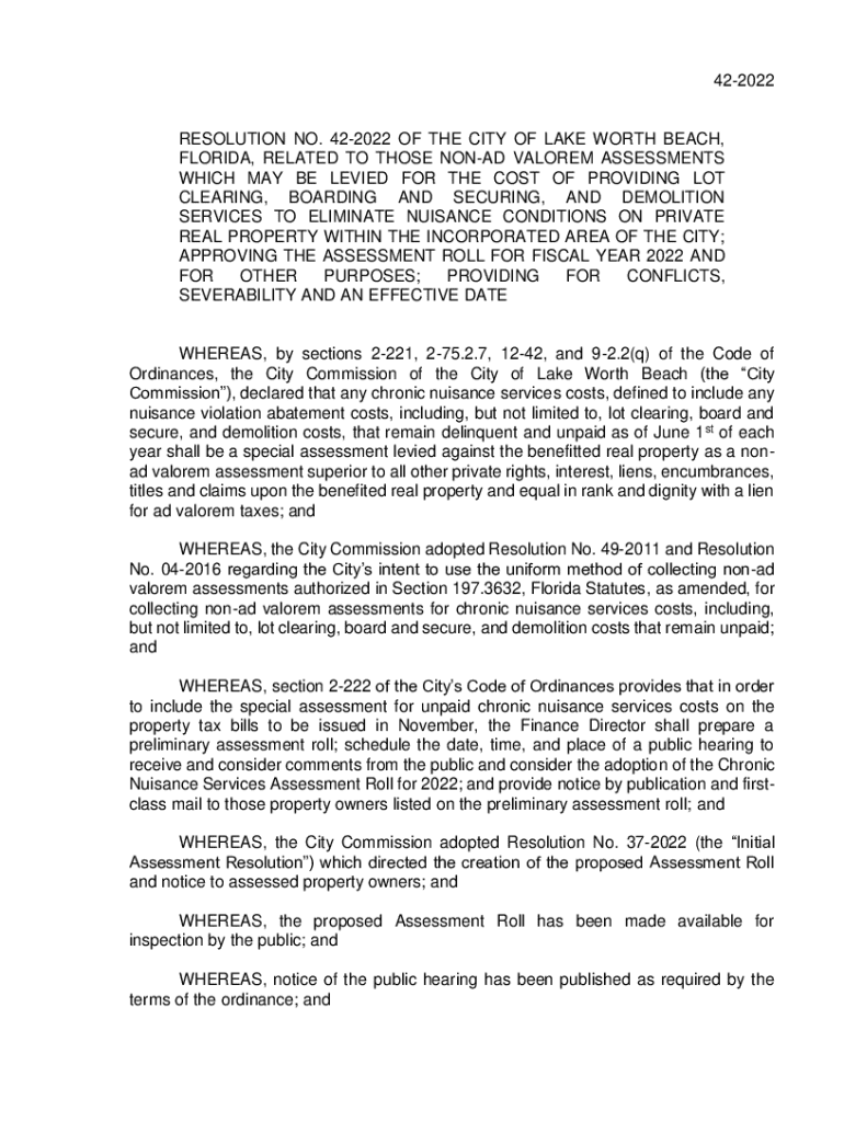 422022RESOLUTION NO. 422022 OF THE CITY OF LAKE WORTH BEACH, FLORIDA, RELATED TO THOSE NONAD VALOREM ASSESSMENTS WHICH MAY BE LEVIED FOR THE COST OF PROVIDING LOT CLEARING, BOARDING AND SECURING,
