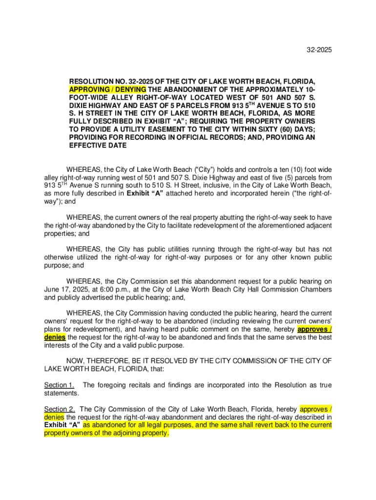 322025RESOLUTION NO. 322025 OF THE CITY OF LAKE WORTH BEACH, FLORIDA, APPROVING / DENYING THE ABANDONMENT OF THE APPROXIMATELY 10FOOTWIDE ALLEY RIGHTOFWAY LOCATED WEST OF 501 AND 507 S. DIXIE HIGHWAY