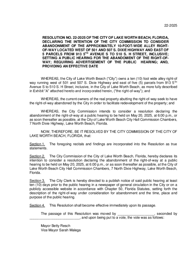 222025 RESOLUTION NO. 222025 OF THE CITY OF LAKE WORTH BEACH, FLORIDA, DECLARING THE INTENTION OF THE CITY COMMISSION TO CONSIDER ABANDONMENT OF THE APPROXIMATELY 10FOOTWIDE ALLEY RIGHTOFWAY LOCATED