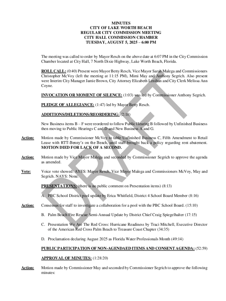 Get the free ROLL CALL: (0:40) Present were Mayor Betty Resch, Vice Mayor Sarah Malega and Commis...