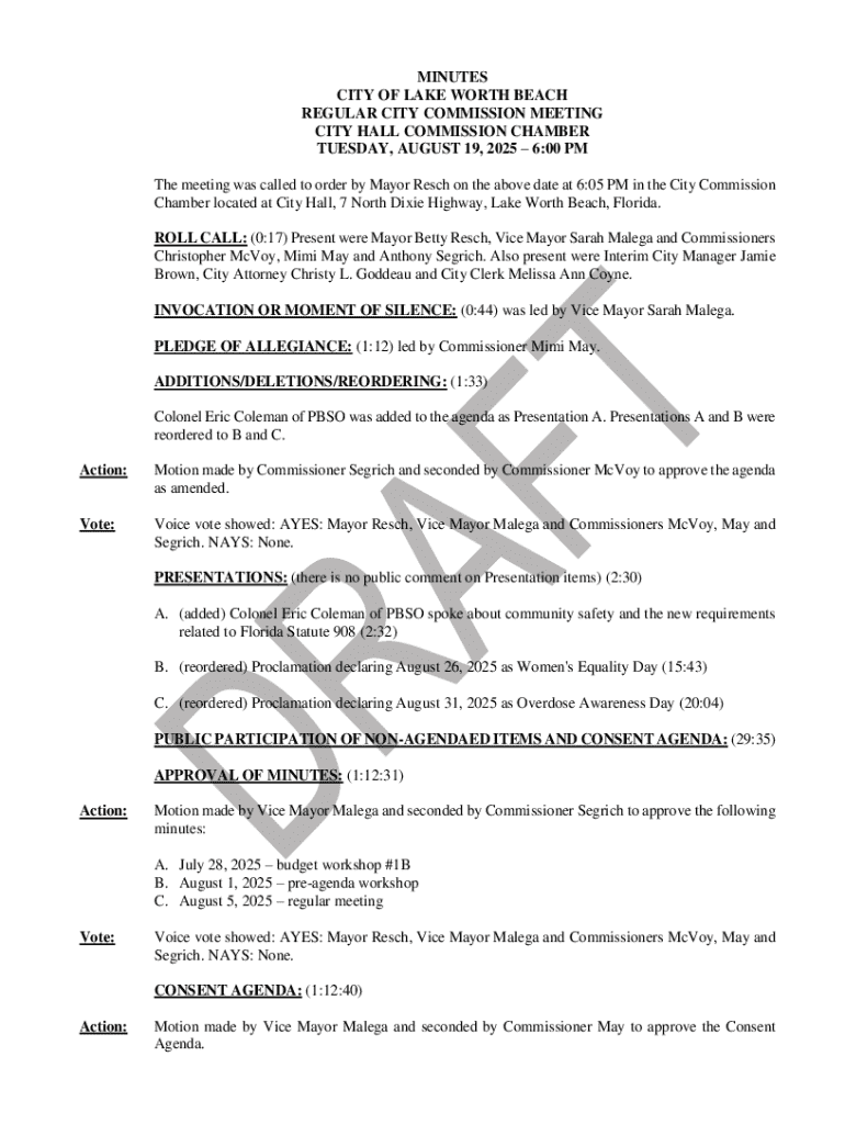 MINUTES CITY OF LAKE WORTH BEACH REGULAR CITY COMMISSION MEETING CITY HALL COMMISSION CHAMBER TUESDAY, AUGUST 19, 20256:00 PM The meeting was called to order by Mayor Resch on the above date at 6:05