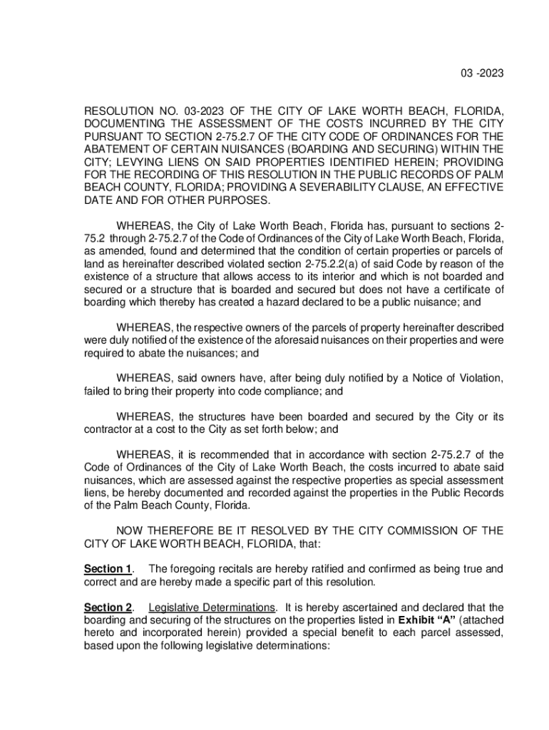03 2023RESOLUTION NO. 032023 OF THE CITY OF LAKE WORTH BEACH, FLORIDA, DOCUMENTING THE ASSESSMENT OF THE COSTS INCURRED BY THE CITY PURSUANT TO SECTION 275.2.7 OF THE CITY CODE OF ORDINANCES FOR THE