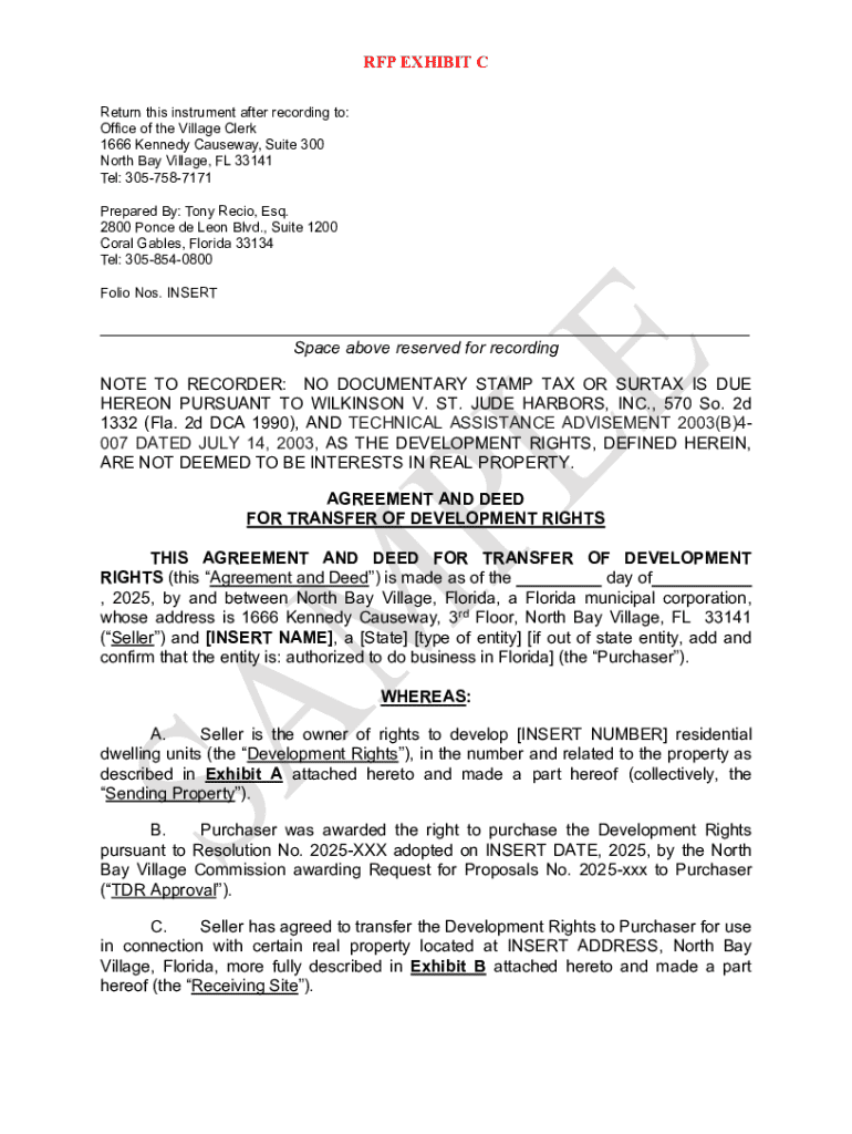 RFP EXHIBIT C Return this instrument after recording to: Office of the Village Clerk 1666 Kennedy Causeway, Suite 300 North Bay Village, FL 33141 Tel: 3057587171 Prepared By: Tony Recio, Esq. 2800