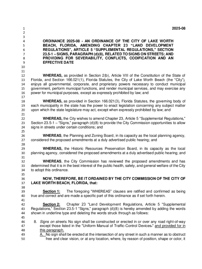 Get the free ORDINANCE 2025-08 - AN ORDINANCE OF THE CITY OF LAKE WORTH
