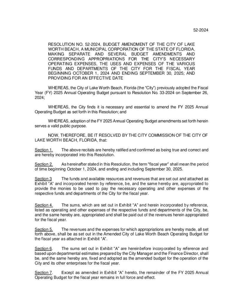 522024RESOLUTION NO. 522024, BUDGET AMENDMENT OF THE CITY OF LAKE WORTH BEACH, A MUNICIPAL CORPORATION OF THE STATE OF FLORIDA, MAKING SEPARATE AND SEVERAL BUDGET AMENDMENTS AND CORRESPONDING APPROPRIATIONS