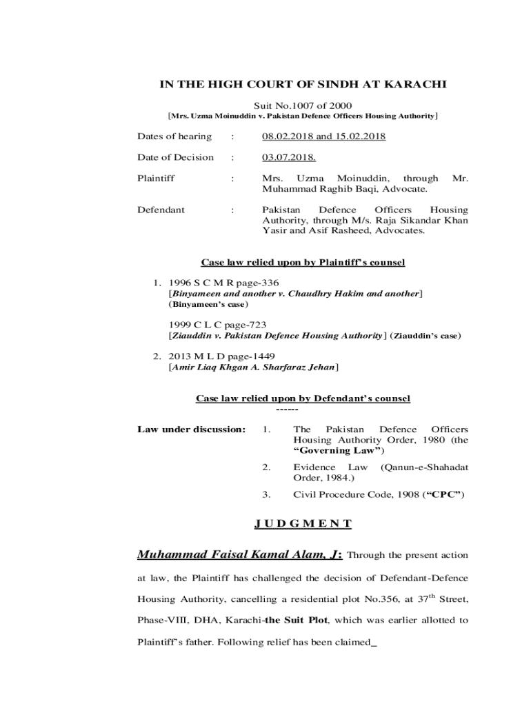 IN THE HIGH COURT OF SINDH AT KARACHI Suit No.1007 of 2000 [Mrs. Uzma Moinuddin v. Pakistan Defence Officers Housing Authority]Dates of hearing:08.02.2018 and 15.02.2018Date of Decision:03.07.2018.Plaintiff:Mrs.