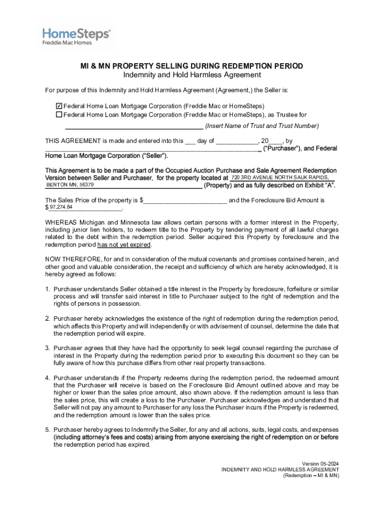 Get the free MI & MN Property Selling During Redemption Period Indemnity and ...