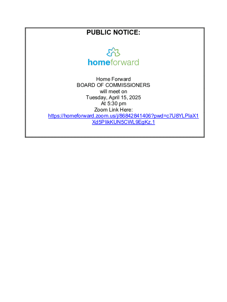 PUBLIC NOTICE:Home Forward BOARD OF COMMISSIONERS will meet on Tuesday, April 15, 2025 At 5:30 pm Zoom Link Here: https://homeforward.zoom.us/j/86842841406?pwdc7U8YLPlaX1 Xd5PIikKUN5CWL9EgKz.1MEMORANDUMTo:From:Community