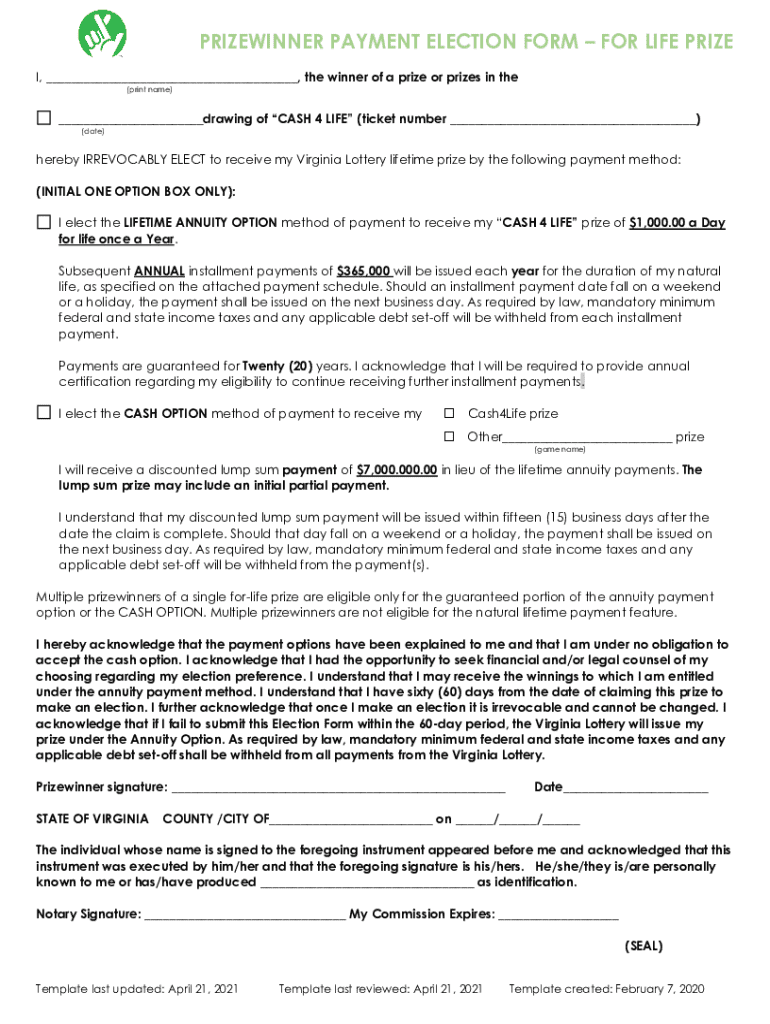 Get the free PRIZEWINNER PAYMENT ELECTION FORM FOR LIFE PRIZE