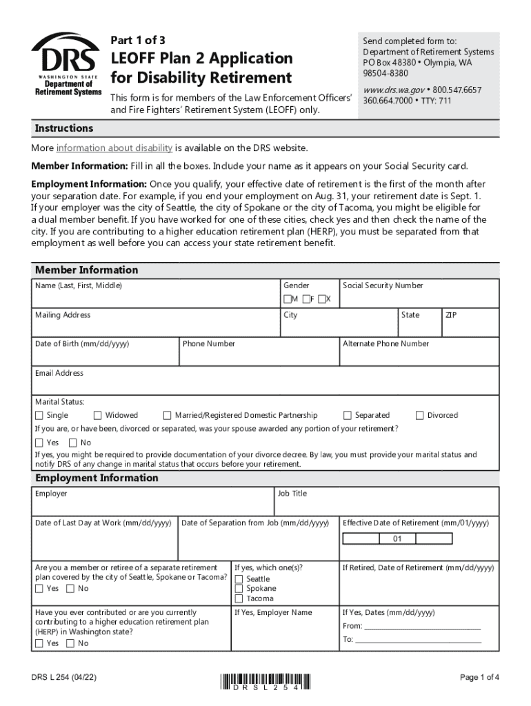 Clear Form Part 1 of 3Send completed form to: Department of Retirement Systems PO Box 48380Olympia, WA 985048380LEOFF Plan 2 Application for Disability Retirement This form is for members of the Law