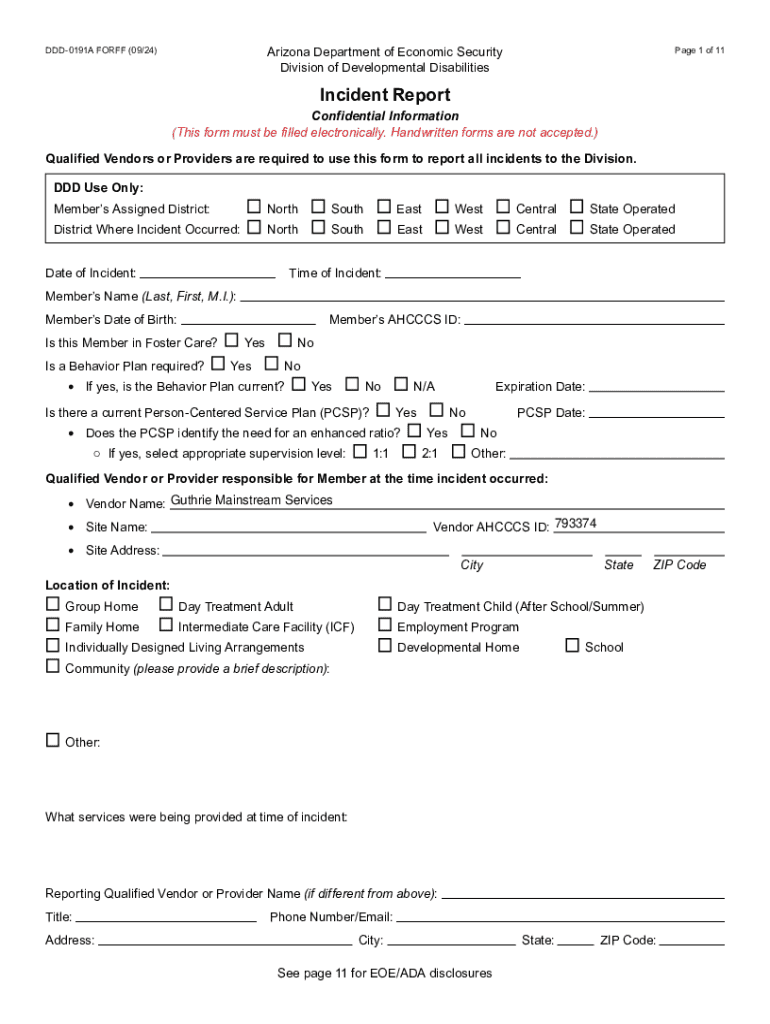 When filling out an incident report in Arizona, certain key components must be included to ensure that the documentation is complete and compliant. Essential information includes personal details of the affected individuals, a thorough description of the incident, and the exact date and time when the event occurred.
