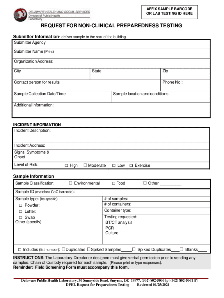 Get the free DPHL Request for Non-Clinical Preparedness Testing 07232013.pdf - dhss delaware