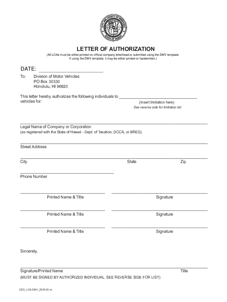 LETTER OF AUTHORIZATION (All LOAs must be either printed on official company letterhead or submitted using the DMV template. If using the DMV template, it may be either printed or handwritten.)DATE: