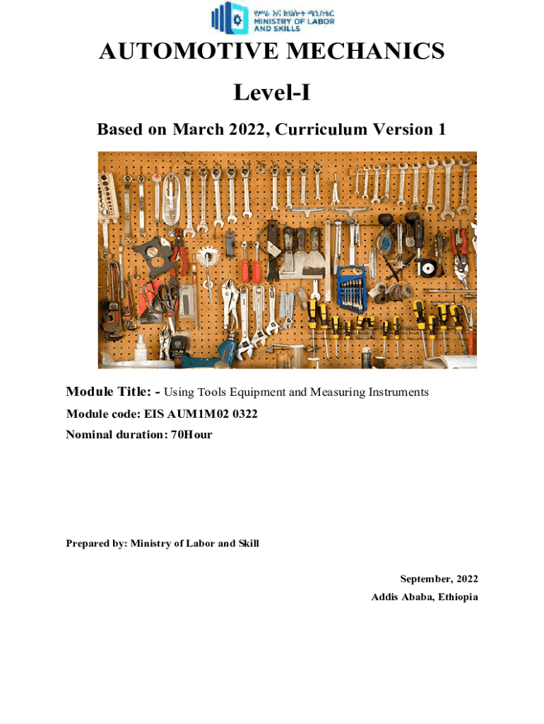 AUTOMOTIVE MECHANICS LevelI Based on March 2022, Curriculum Version 1Module Title:Using Tools Equipment and Measuring Instruments Module code: EIS AUM1M02 0322 Nominal duration: 70HourPrepared by: