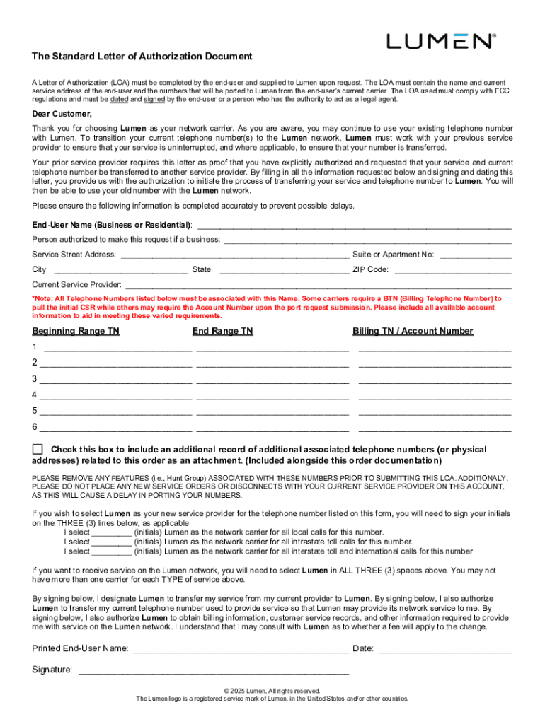 The Standard Letter of Authorization Document A Letter of Authorization (LOA) must be completed by the enduser and supplied to Lumen upon request. The LOA must contain the name and current service