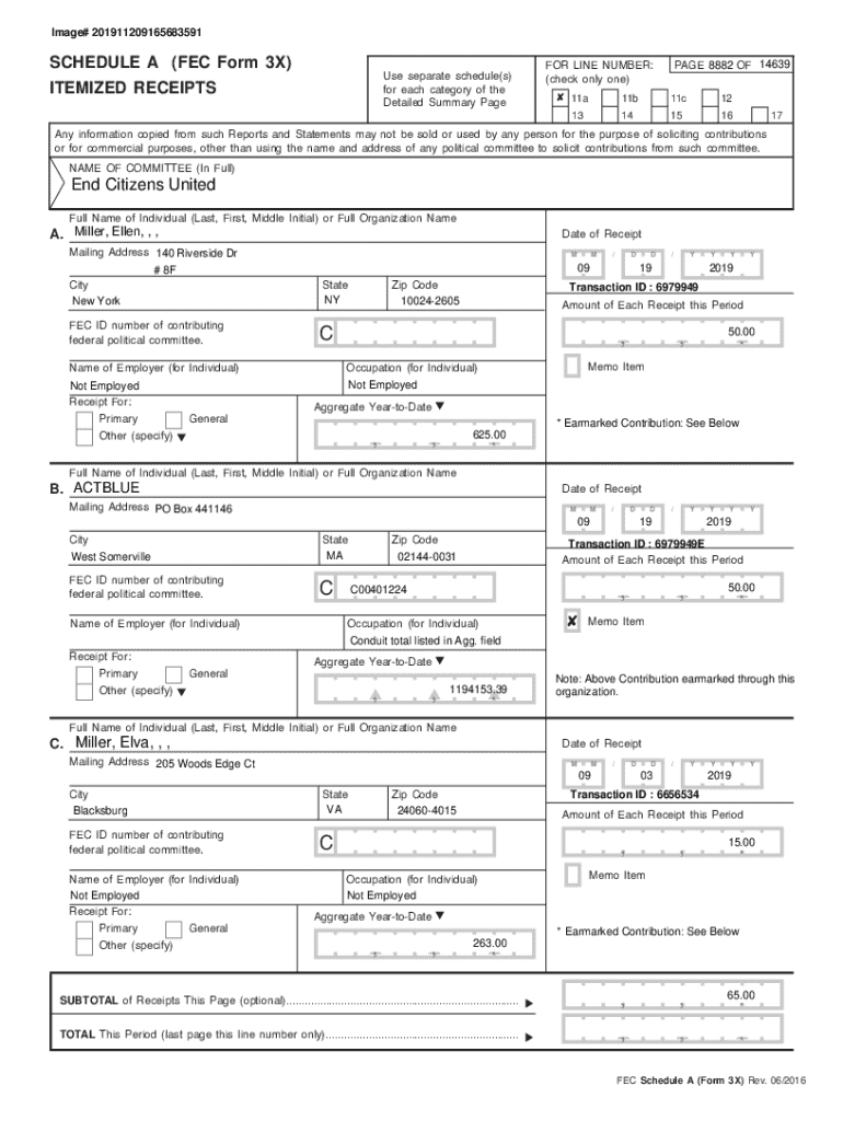 Image# 201911209165683591SCHEDULE A (FEC Form 3X) ITEMIZED RECEIPTSPAGE 8882 OF 14639FOR LINE NUMBER: (check only one)Use separate schedule(s) for each category of the Detailed Summary Page 11a11b11c121314151617Any