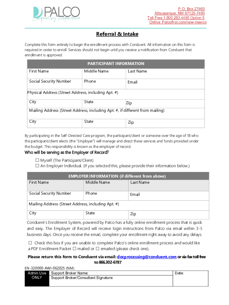 P.O. Box 27460 Albuquerque, NM 871257460 Toll Free 1.800.283.4465 Option 5 Online: Palcofirst.com/newmexicoReferral & Intake Complete this form entirely to begin the enrollment process with Conduent.