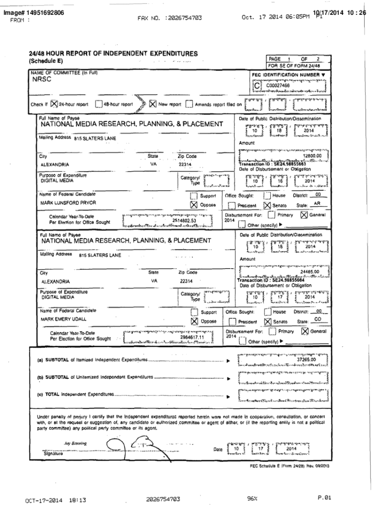 Image# 14951692806 FAX NO.FROM :Oct.:202S75470310/17/2014 10 : 2617 2014 06:05PM24/48 HOUR REPORT OF INDEPENDENT EXPENDITURES (Schedule E)PIPAGE 1 OF FOR SE OF FORM 24/48NAME OF COMMITTEE (In Full)FEC