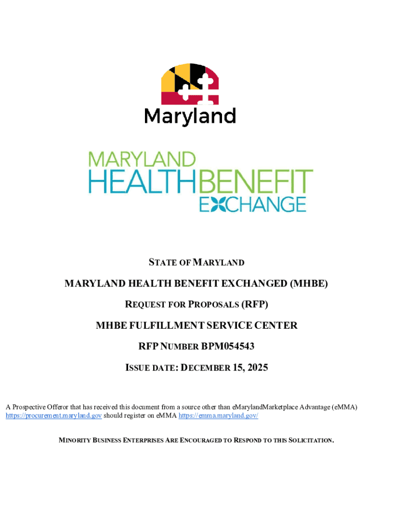 STATE OF MARYLAND MARYLAND HEALTH BENEFIT EXCHANGED (MHBE) REQUEST FOR PROPOSALS (RFP) MHBE FULFILLMENT SERVICE CENTER RFP NUMBER BPM054543 ISSUE DATE: DECEMBER 15, 2025A Prospective Offeror that